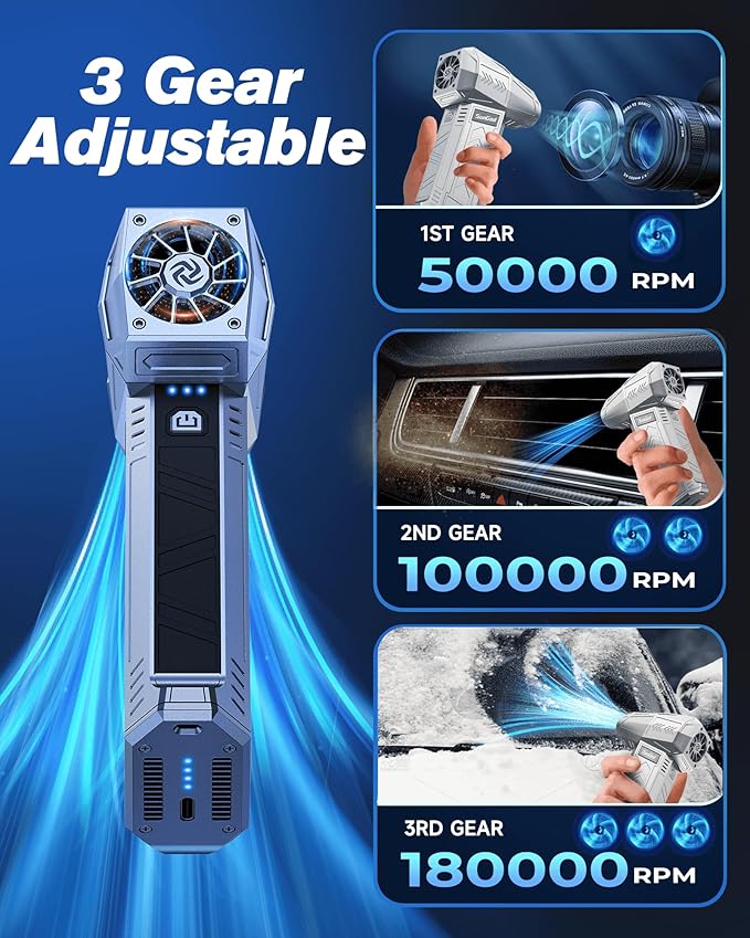 Compressed Air Duster - 180000RPM Electric Cleaner Kit with 3 Gear Adjustable, Replace Canned Air, Mini Rechargeable Cordless Air Blower for Keyboard, PC, Car Cleaning, Gifts for Men (Silver Gray)